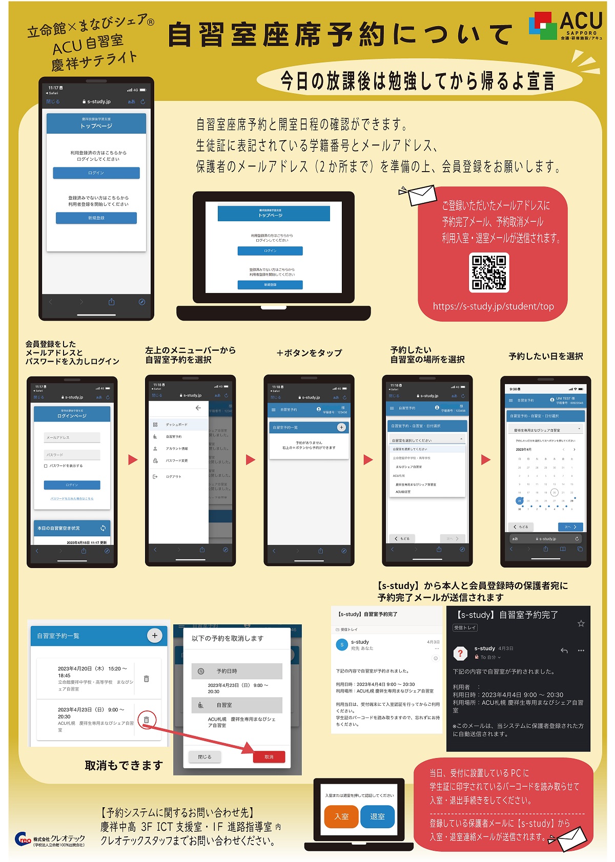 立命館×まなびシェア®ACU自習室慶祥サテライト 予約システム導入開始のお知らせ(2023年5月1日スタート) 初めてご利用の方は会員登録が必要です。 慶祥放課後学習支援トップページより「新規登録」ボタンをクリックし、会員登録をお願いしております。
